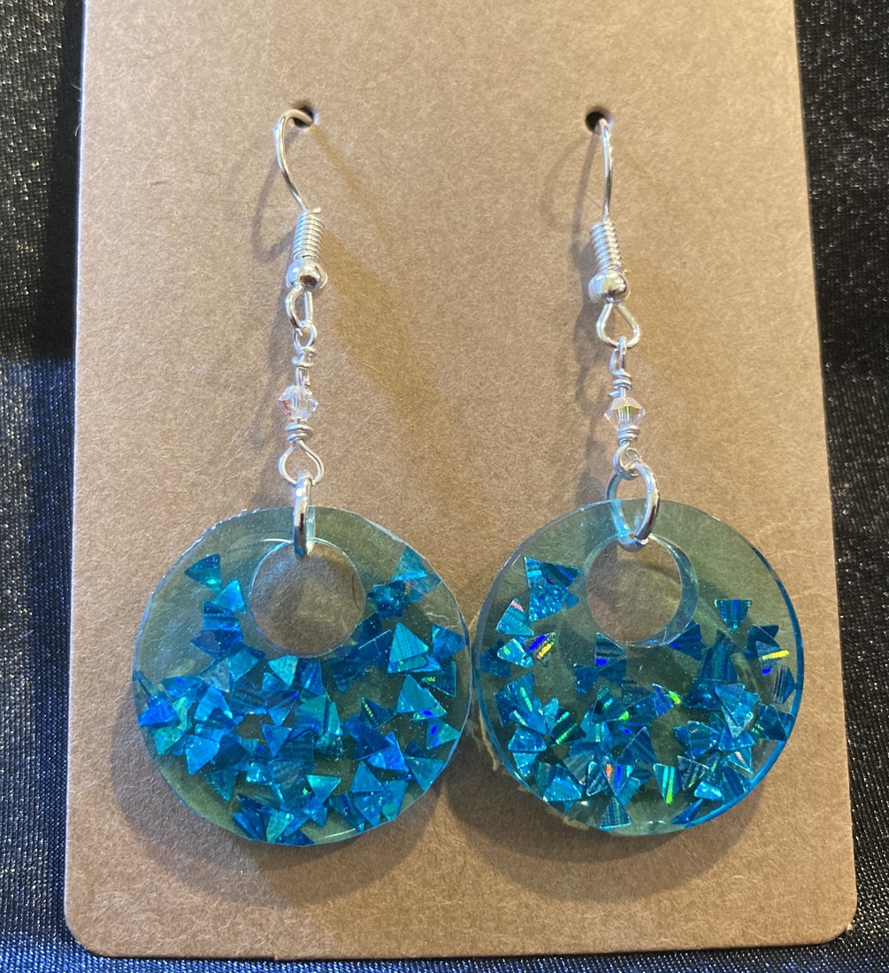 Turquoise triangle glitter resin earrings.  Embellished with a Swarovski crystal bead.  Lightweight and perfect for a night out or pageant event. Circle measures 1" diameter.