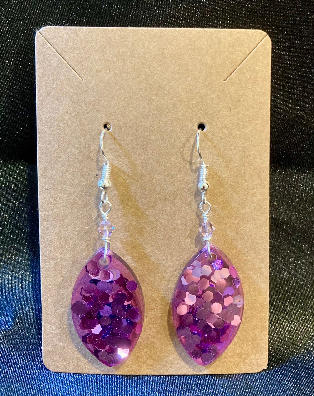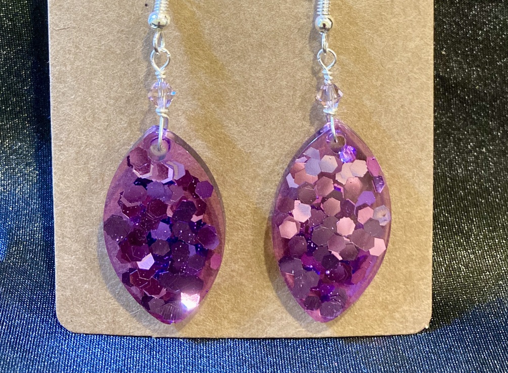 Purple glitter resin earrings. Embellished with a Swarovski crystal bead. Lightweight and perfect for a night out or pageant event. Oval measures 1.25"L x 3/4"W